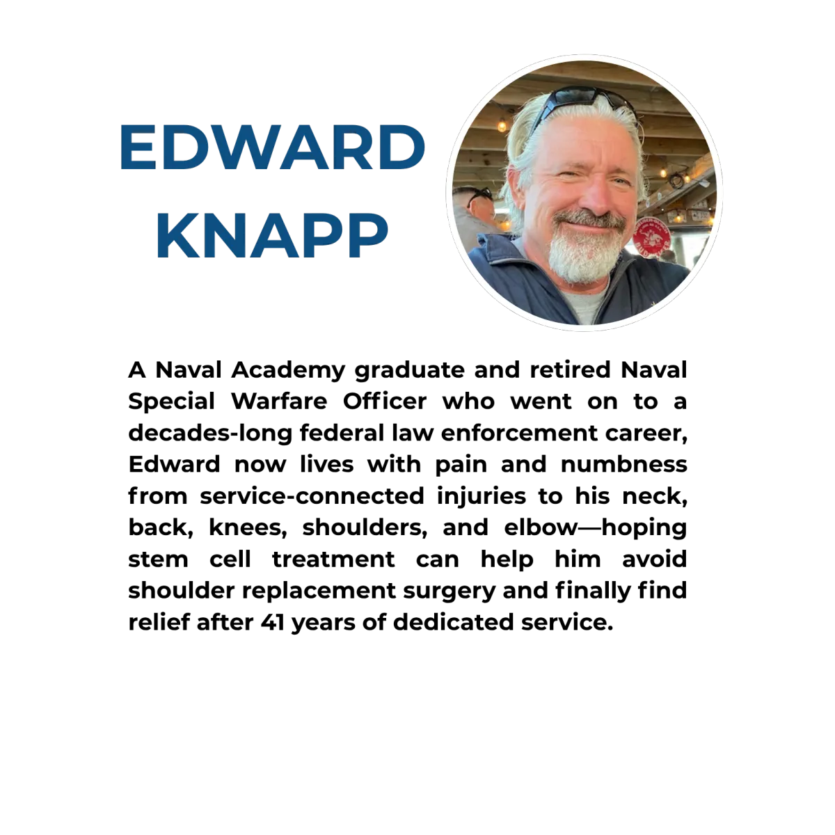 A Naval Academy graduate and retired Naval Special Warfare Officer who went on to a decades-long federal law enforcement career, Edward now lives with pain and numbness from service-connected injuries to his neck, back, knees, shoulders, and elbow—hoping stem cell treatment can help him avoid shoulder replacement surgery and finally find relief after 41 years of dedicated service.