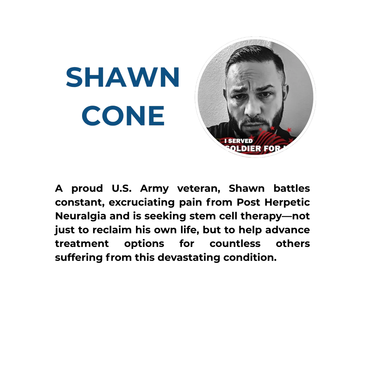 A proud U.S. Army veteran, Shawn battles constant, excruciating pain from Post Herpetic Neuralgia and is seeking stem cell therapy—not just to reclaim his own life, but to help advance treatment options for countless others suffering from this devastating condition.
