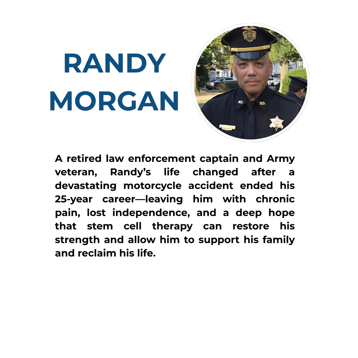A retired law enforcement captain and Army veteran, Randy’s life changed after a devastating motorcycle accident ended his 25-year career—leaving him with chronic pain, lost independence, and a deep hope that stem cell therapy can restore his strength and allow him to support his family and reclaim his life.