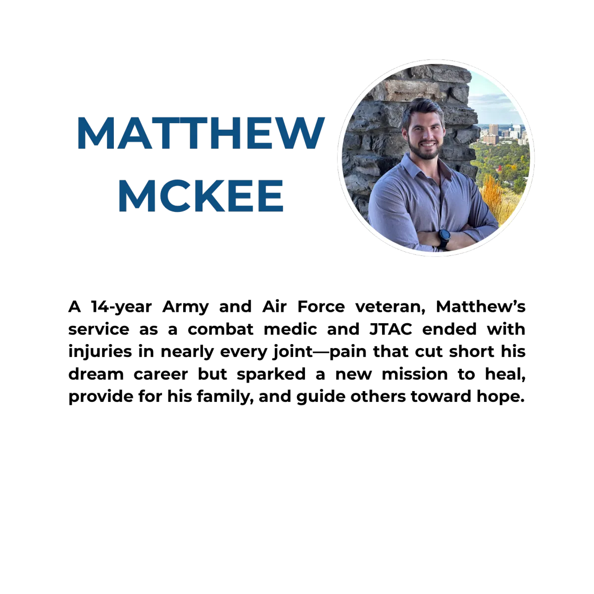 A 14-year Army and Air Force veteran, Matthew’s service as a combat medic and JTAC ended with injuries in nearly every joint—pain that cut short his dream career but sparked a new mission to heal, provide for his family, and guide others toward hope.