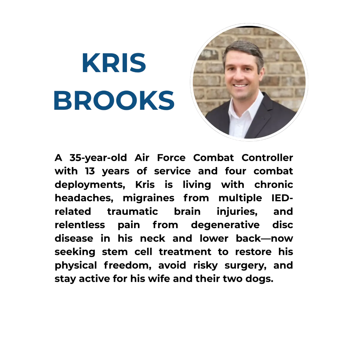 A 35-year-old Air Force Combat Controller with 13 years of service and four combat deployments, Kris is living with chronic headaches, migraines from multiple IED-related traumatic brain injuries, and relentless pain from degenerative disc disease in his neck and lower back—now seeking stem cell treatment to restore his physical freedom, avoid risky surgery, and stay active for his wife and their two dogs.