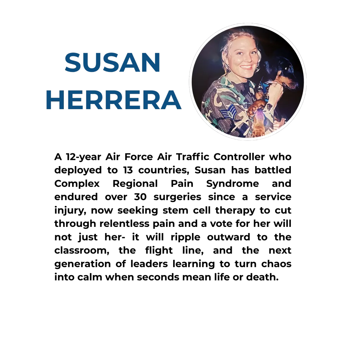 A 12-year Air Force Air Traffic Controller who deployed to 13 countries, Susan has battled Complex Regional Pain Syndrome and endured over 30 surgeries since a service injury, now seeking stem cell therapy to cut through relentless pain and a vote for her will not just her- it will ripple outward to the classroom, the flight line, and the next generation of leaders learning to turn chaos into calm when seconds mean life or death.