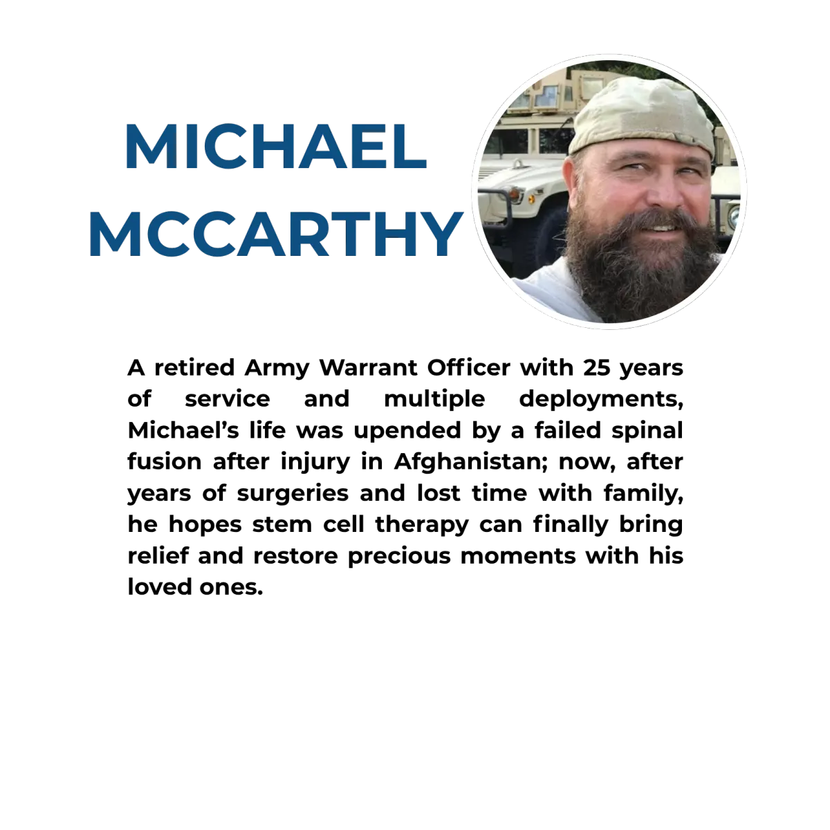 A retired Army Warrant Officer with 25 years of service and multiple deployments, Michael’s life was upended by a failed spinal fusion after injury in Afghanistan; now, after years of surgeries and lost time with family, he hopes stem cell therapy can finally bring relief and restore precious moments with his loved ones.
