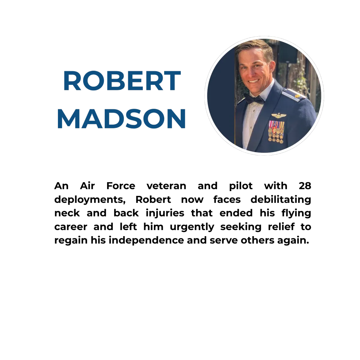 An Air Force veteran and pilot with 28 deployments, Robert now faces debilitating neck and back injuries that ended his flying career and left him urgently seeking relief to regain his independence and serve others again.