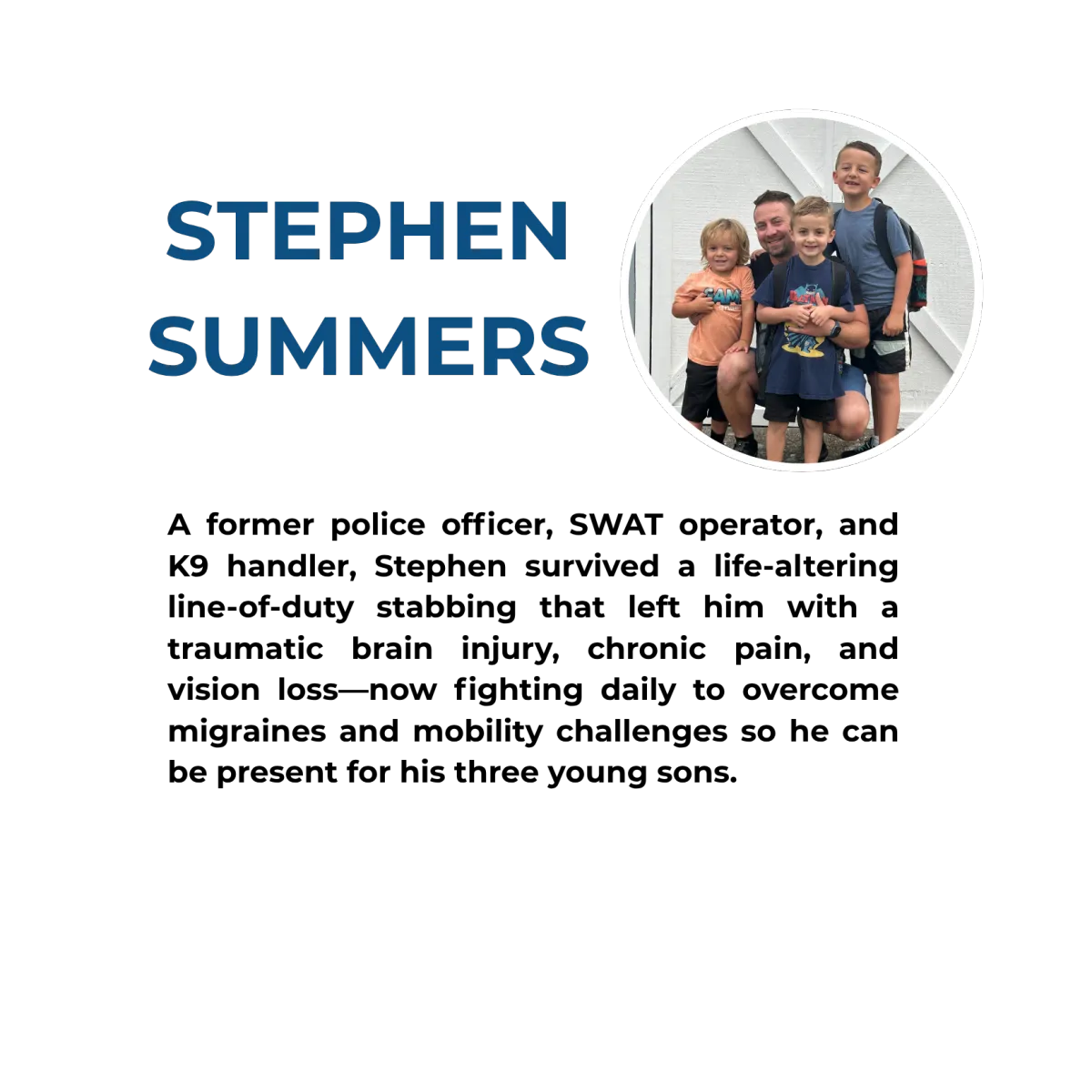 A former police officer, SWAT operator, and K9 handler, Stephen survived a life-altering line-of-duty stabbing that left him with a traumatic brain injury, chronic pain, and vision loss—now fighting daily to overcome migraines and mobility challenges so he can be present for his three young sons.