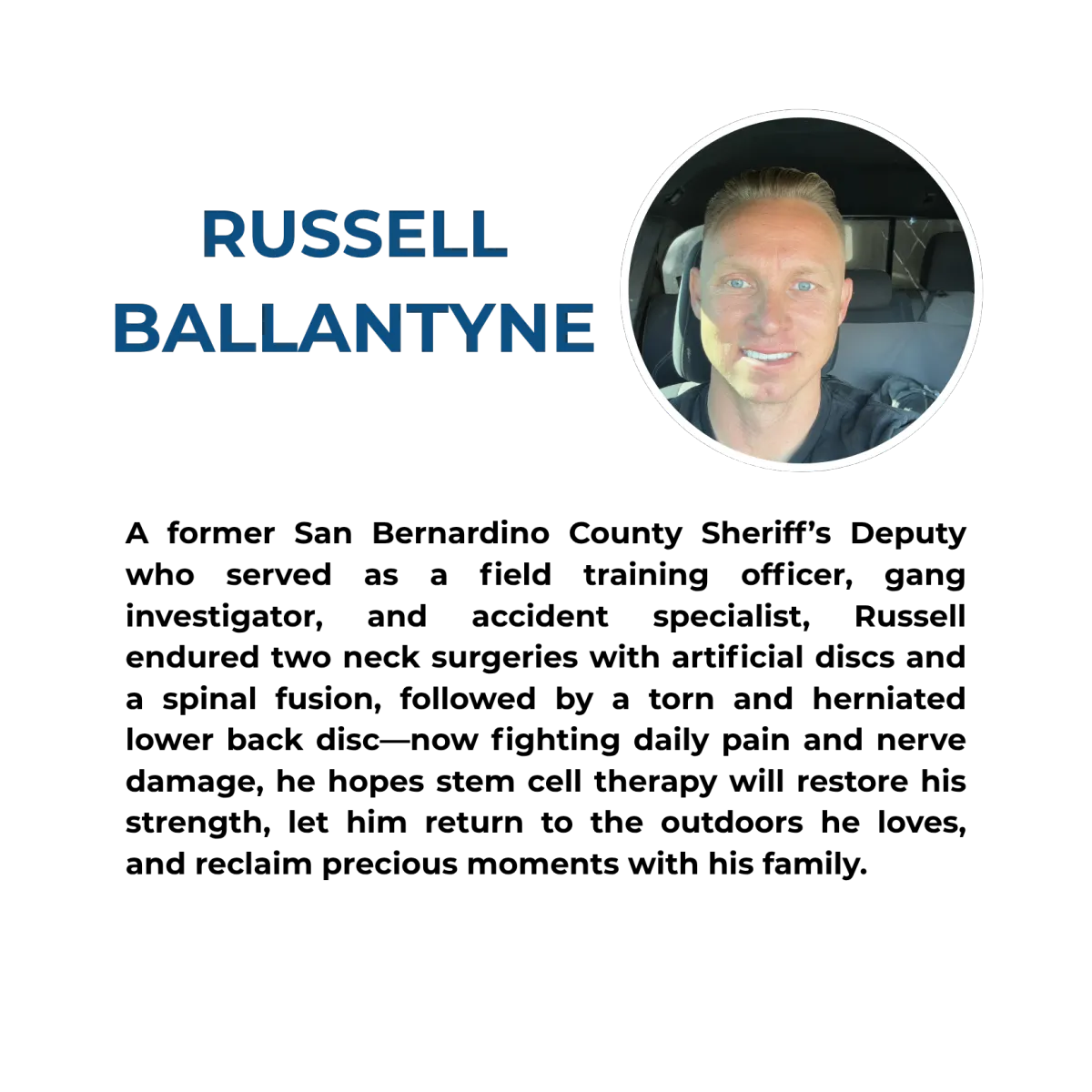 A former San Bernardino County Sheriff’s Deputy who served as a field training officer, gang investigator, and accident specialist, Russell endured two neck surgeries with artificial discs and a spinal fusion, followed by a torn and herniated lower back disc—now fighting daily pain and nerve damage, he hopes stem cell therapy will restore his strength, let him return to the outdoors he loves, and reclaim precious moments with his family.